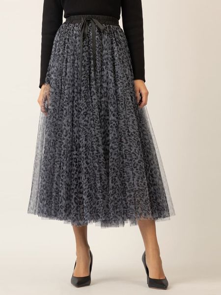 – wysokość pasa: high waist- pas: ściągacz tunelowy- detale: tiul- krój: litera A- wzór: panterka