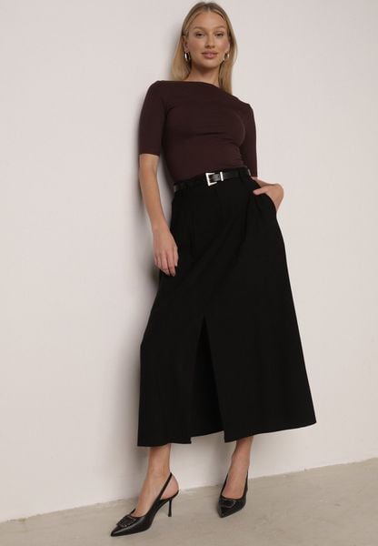Czarna Wiskozowa Spódnica o Rozkloszowanym Kroju z Rozcięciem i Paskiem Jaelia