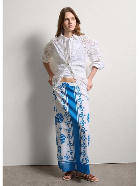 Niebiesko-Biała Rozkloszowana Spódnica z Wiskozy w Kwiatowy Wzór z Guzikami Moragi