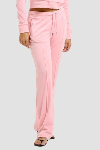 Różowe damskie spodnie Tina od Juicy Couture, uszyte z wysokiej jakości weluru, łączą w sobie komfort noszenia i wyjątkowy design.Modelka ma na sobie produkt w rozmiarze: S.Wymiary produktu w rozmiarze S: szerokość w pasie: 36,5 cm, długość nogawki od zewnątrz: 103 cm, długość nogawki od wewnątrz: 79,5 cm.