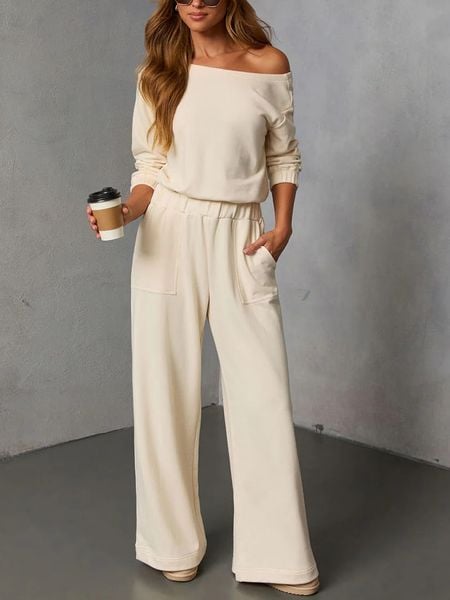 W zestawie:- bluza- spodnie dresoweBluza:- dekolt: łódka- zakończenia rękawów: ściągacz- krój: luźny- look: jednokolorowySpodnie dresowe:- pas / ściągacz: elastyczny- kieszenie: wpuszczane- zakończenia nogawek: dzwony- krój: luźny- look: jednokolorowy