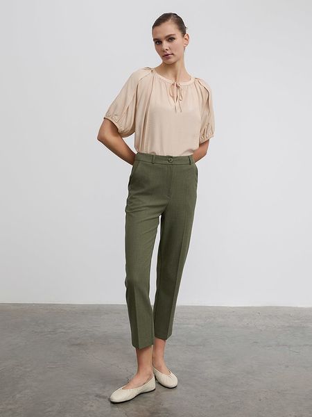 – wysokość pasa: high waist- fason: regular fit- krój nogawek: prosty- szlufki na pasek: tak- zapięcie: guzik i suwak- kieszenie: wpuszczane- długość nogawki: 7/8- detale: kant- look: jednokolorowyUwaga: Przy wyborze właściwego wariantu zaleca się korzystanie z tabeli rozmiarów.