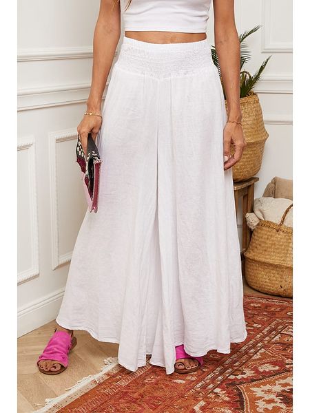 – czysty len- wysokość pasa: high waist- pas: marszczony- krój nogawek: szeroki- krój: luźny- look: jednokolorowy