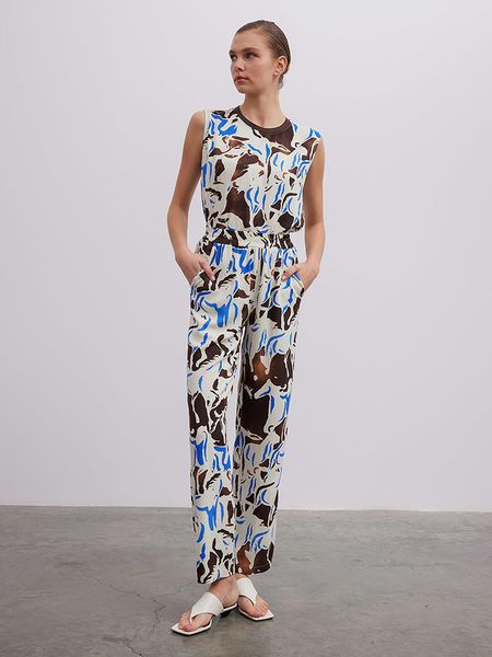 – czysta wiskoza- wysokość pasa: high waist- fason: regular fit- krój nogawek: prosty- pas / ściągacz: elastyczny- kieszenie: wpuszczane- wzór: na całościUwaga: Przy wyborze właściwego wariantu zaleca się korzystanie z tabeli rozmiarów.