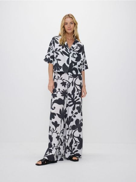 Spodnie typu palazzo, uszyte z wiskozowej tkaniny.