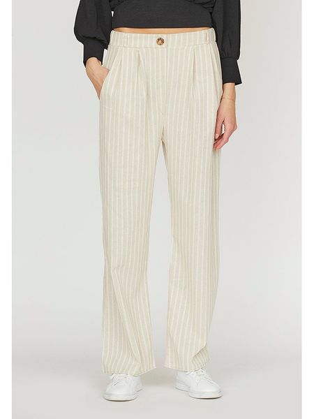 – wysokość pasa: high waist- szlufki na pasek: tak- zapięcie: guzik i suwak- kieszenie: wpuszczane- krój: luźny- wzór: paski