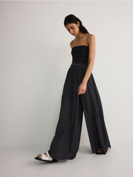 Spodnie typu palazzo, uszyte z gładkiej tkaniny.
