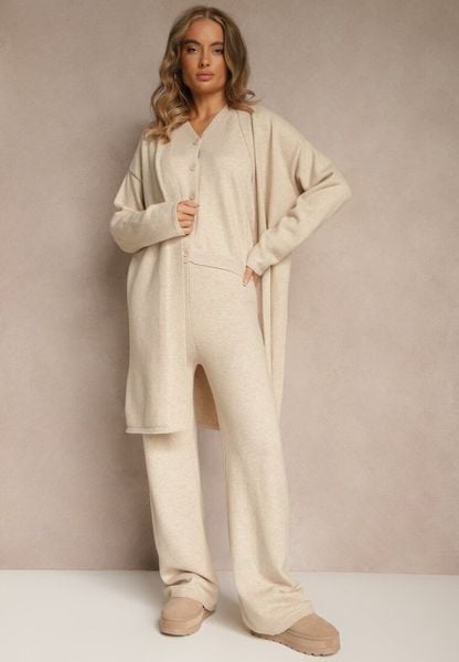 Jasnobeżowy Dzianinowy Komplet z Wełną Kamizelka Długi Kardigan i Spodnie Otizela