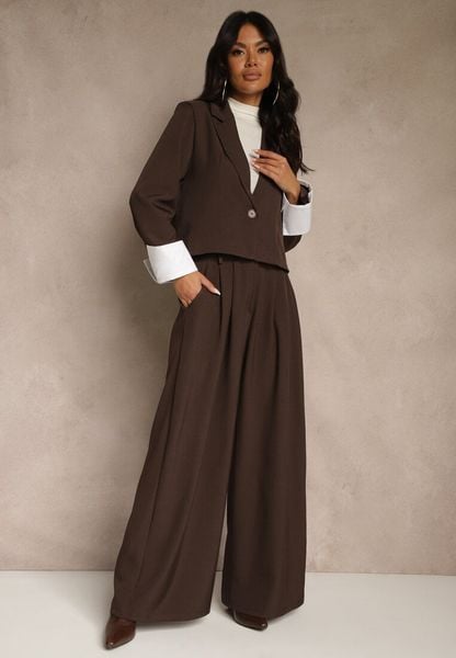 Brązowy Komplet Garniturowy Dwurzędowa Marynarka Oversize i Szerokie Spodnie Tevalda