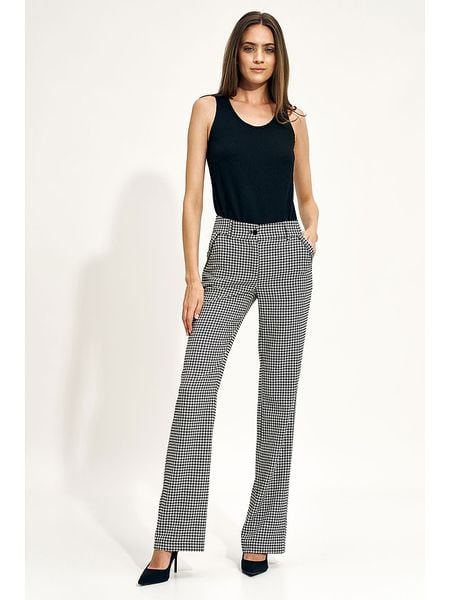 – wysokość pasa: high waist- zapięcie: guzik i suwak- szlufki na pasek: tak- kieszenie: wpuszczane- krój: prosty- wzór: pepitka