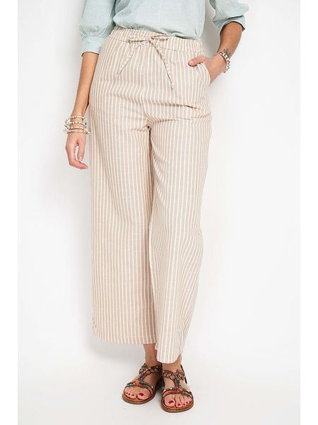 – z dodatkiem lnu- pas: ściągacz tunelowy- kieszenie: wpuszczane- zakończenia nogawek: dzwony- krój: luźny- wzór: paskiUwaga: Na metkach odzieży tej marki znajdują się rozmiary francuskie. Rozmiarówka została przez nas przeliczona. Podane do wyboru warianty rozmiarów odpowiadają standardowym europejskim rozmiarom konfekcji. Prosimy zapoznać się z zamieszczonym objaśnieniem rozmiarów.
