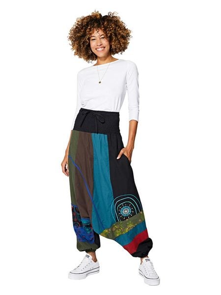 – czysta bawełna- pas: marszczony- niski krok- zakończenia nogawek: elastyczny ściągacz- krój: luźny- wzór: na całościWskazówka: Na metkach odzieży tej marki znajdują się rozmiary francuskie. Rozmiarówka została przez nas przeliczona. Podane do wyboru warianty rozmiarów odpowiadają standardowym europejskim rozmiarom konfekcji. Prosimy zapoznać się z zamieszczonym objaśnieniem rozmiarów: