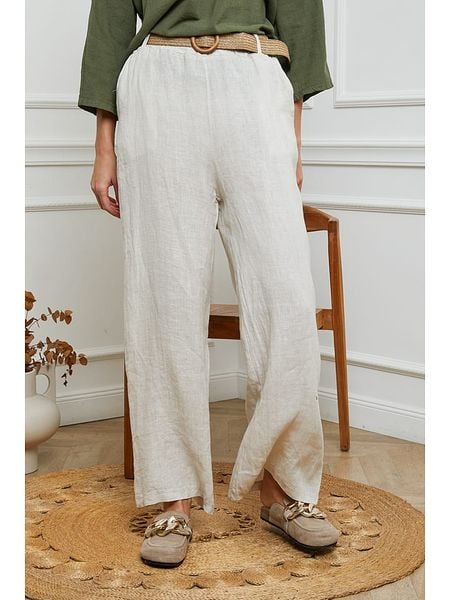 – czysty len- pas / ściągacz: elastyczny- szlufki na pasek: tak- zdejmowany pasek: tkanina- kieszenie: wpuszczane- zakończenia nogawek: dzwony- krój: prosty- look: jednokolorowy