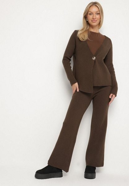 Brązowy Dzianinowy Komplet z Wiskozą Spodnie i Asymetryczny Kardigan Uninassa