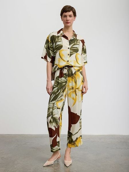 – czysta wiskoza- wysokość pasa: high waist- fason: regular fit- krój nogawek: prosty- pas: ściągacz tunelowy- kieszenie: wpuszczane- wzór: na całościUwaga: Przy wyborze właściwego wariantu zaleca się korzystanie z tabeli rozmiarów.