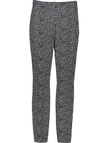 – wysokość pasa: regular waist- fason: Slim fit- krój nogawek: wąski- zapięcie: haczyk i suwak- detale: zakładki- wzór: kropki