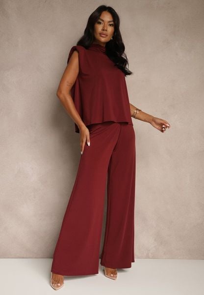 Bordowy Komplet Spodnie o Szerokim Kroju i Bluzka Ozdobiona Wiązaniem Halomia