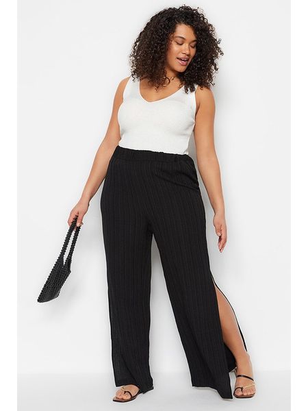 – wysokość pasa: high waist- pas / ściągacz: elastyczny- zakończenia nogawek: z rozcięciem- krój: luźny- look: jednokolorowy, marszczony