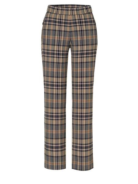 – wysokość pasa: high waist- fason: regular fit- krój nogawek: prosty- pas / ściągacz: elastyczny- kieszenie: zasuwane- wzór: kratka