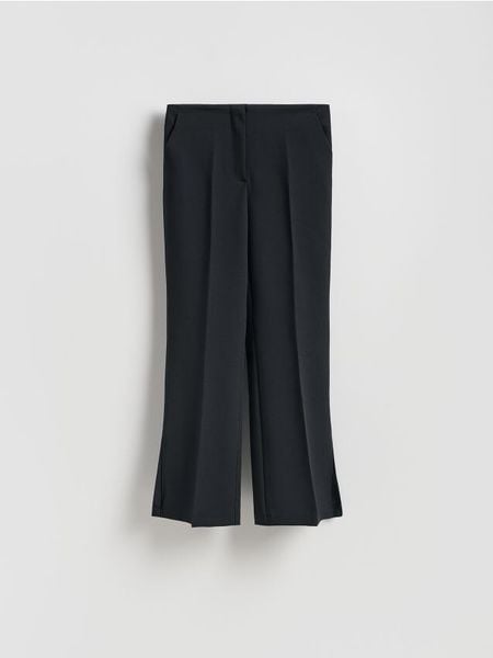 Spodnie o kroju flare, wykonane z tkaniny z dodatkiem wiskozy.