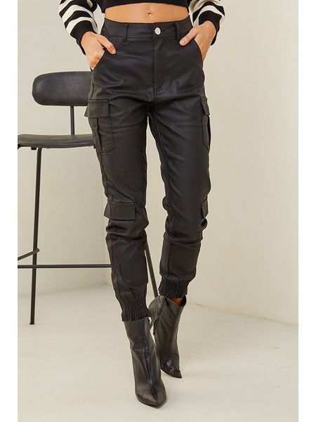 – wysokość pasa: high waist- fason: slim fit- krój nogawek: wąski- zapięcie: guzik i suwak- szlufki na pasek: tak- kieszenie: wpuszczane, tylne, cargo- zakończenia nogawek: prążkowany ściągacz- look: imitacja skóry