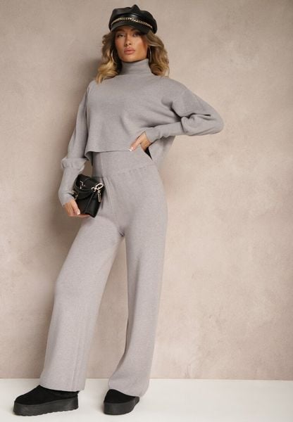 Szary Komplet Dzianinowy z Wiskozą Spodnie o Szerokim Kroju Góra z Golfem Norathira