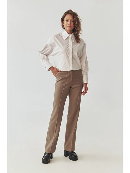 – z dodatkiem wełny- wysokość pasa: high waist- fason: regular fit- krój nogawek: prosty- szlufki na pasek: tak- zapięcie: haczyk i suwak- kieszenie: wpuszczane- detale: kant- look: jednokolorowy