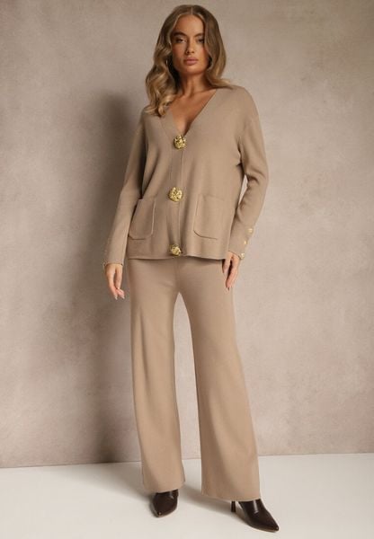 Beżowy Komplet z Dzianiny z Wiskozą Spodnie i Sweter z Ozdobnymi Guzikami Unarea