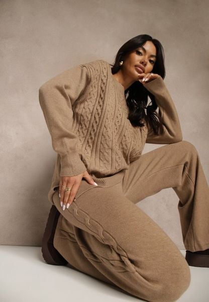 Ciemnobeżowy Komplet z Wełną i Bawełną Sweter ze Splotem i Szerokie Spodnie Reinettia