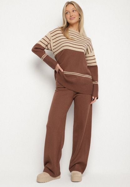 Brązowy Dzianinowy Komplet z Wełną Sweter w Paski i Spodnie Raleina