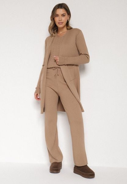 Ciemnobeżowy Komplet Dzianinowy z Bawełną Spodnie Kamizelka i Długi Kardigan Meviravia