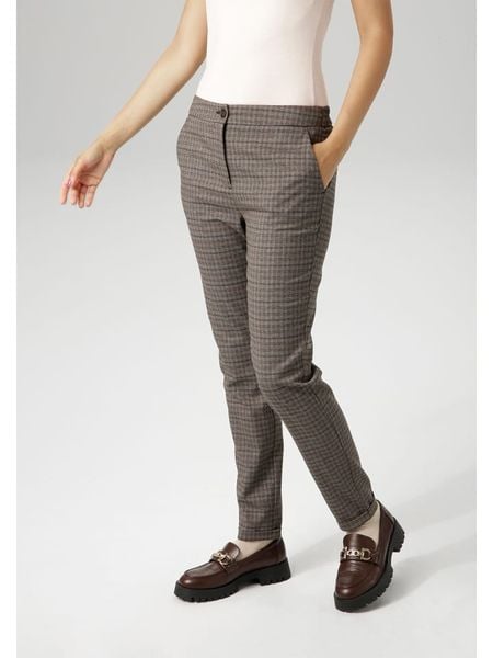 – wysokość pasa: regular waist- fason: slim fit- krój nogawek: wąski- pas / ściągacz: elastyczny- zapięcie: guzik i suwak- kieszenie: wpuszczane- wzór: kratka