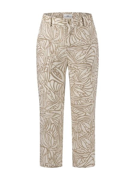 – czysty len- zapięcie: guzik i suwak- pas / ściągacz: elastyczny- szlufki na pasek: tak- kieszenie: wpuszczane i tylne- długość nogawki: 7/8- krój: prosty- wzór: na całości