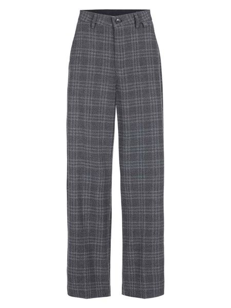 – wysokość pasa: high waist- fason: comfort fit- krój nogawek: szeroki- szlufki na pasek: tak- zapięcie: guzik i suwak- kieszenie: wpuszczane- wzór: kratka