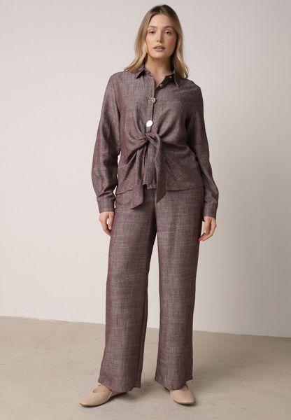 Brązowy Komplet z Lnem i Wiskozą Szerokie Spodnie i Koszula z Wiązaniem Ravilith