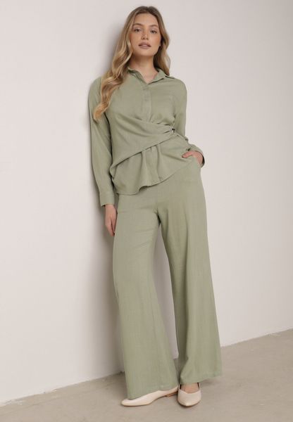 Zielony Wiskozowy Komplet Spodnie z Szerokimi Nogawkami i Gumką w Talii Koszula na Guziki Tinamars