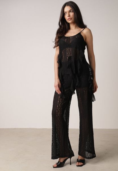 Czarny Eteryczny Komplet z Koronką i Falbankami Top i Spodnie Wide Leg Pretilaine