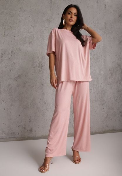 Różowy Oversizowy Komplet Zdobiony Cyrkoniami T-shirt i Spodnie Arnateia