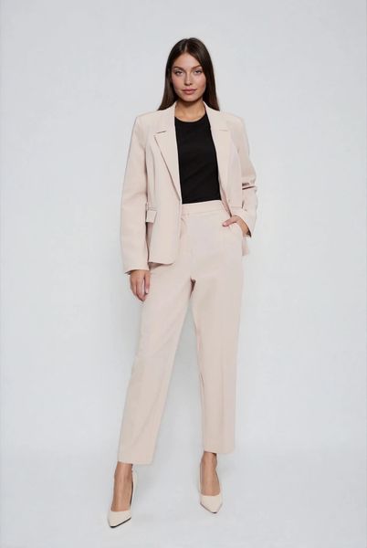 Beżowy komplet damski Anette – żakiet i spodnie z szeroką nogawką z ozdobnym kwiatem PLUS SIZE XXL OVERSIZE WIOSNA