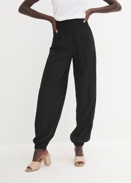 Miękko układające się spodnie z marszczeniem w pasie i ściągaczem u dołu nogawki. Spodnie z marszczeniem w pasie. Wygodna długość stanu, szerokie nogawki marszczone u dołu. Przyjemna w noszeniu wiskoza. Długość mierzona od kroku ok. 78,5 cm (rozm. 42). Można prać w pralce.