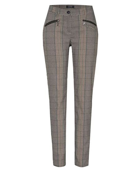 – wysokość pasa: regular waist- fason: skinny fit- krój nogawek: wąski- szlufki na pasek: tak- zapięcie: guzik i suwak- detale: dekoracyjne zamki błyskawiczne- wzór: kratka
