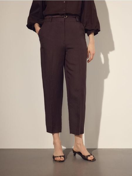 Spodnie o lekko zwężonym kroju, wykonane z tkaniny z lnem i wiskozą.