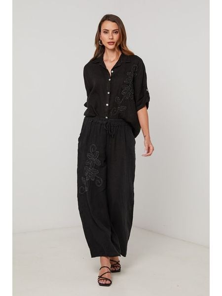 Czarny Komplet z Wiskozy Zdobiony Haftem Koszula i Spodnie Oversize Iffiselle