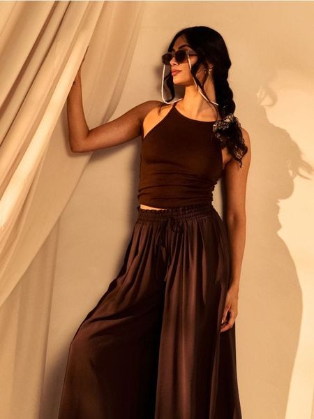 Brązowy Komplet z Wiskozą Szerokie Spodnie i Koszulka z Usztywnionymi Ramionami Neidra