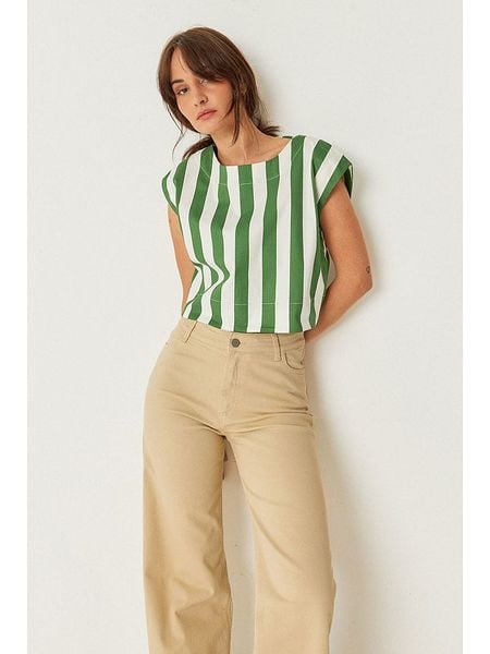 Beżowy Komplet z Wiskozy w Pionowe Prążki Top i Szerokie Spodnie Miltebia