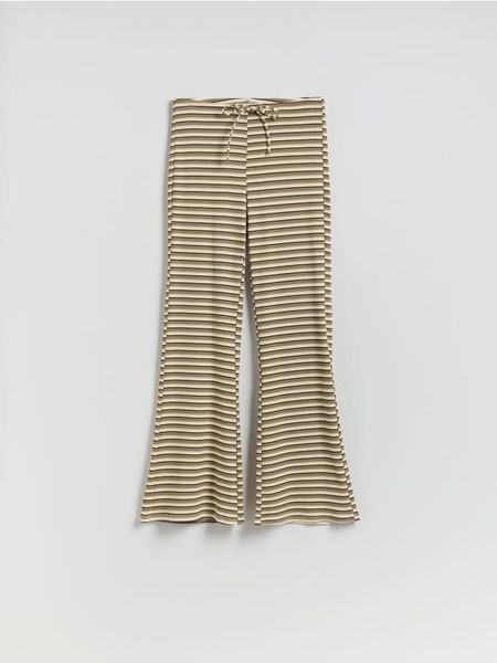 Spodnie o kroju flare, wykonane z dzianiny z bawełną.