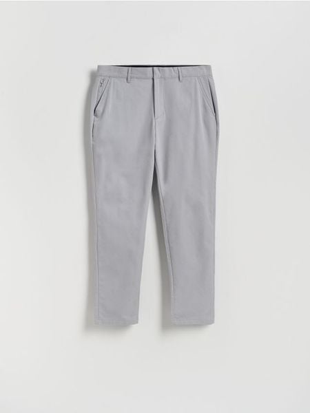 Spodnie typu chino o dopasowanym kroju, wykonane z tkaniny z bawełną.
