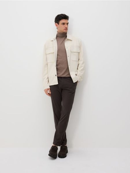 Spodnie typu chino o dopasowanym kroju, wykonane z tkaniny z bawełną.