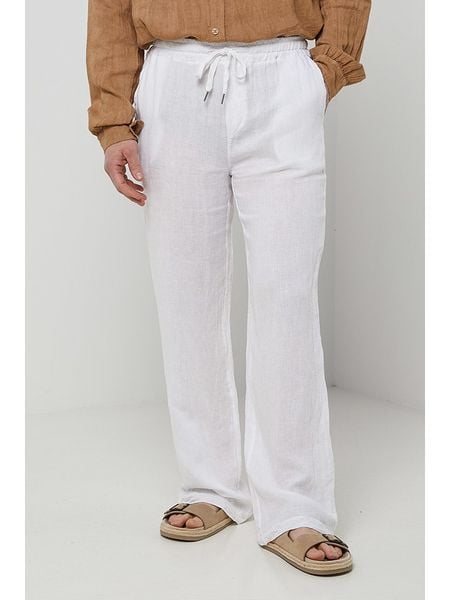 – czysty len- wysokość pasa: regular waist- pas: ściągacz tunelowy- kieszenie: wpuszczane- krój: luźny- look: jednokolorowy