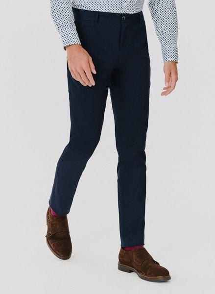 Granatowe spodnie męskie – Pako Lorente. Klasyczne spodnie w kolorze granatowym. Casualowe spodnie męskie o widocznej strukturze materiału. Skład: 97% bawełna, 3% elastan.